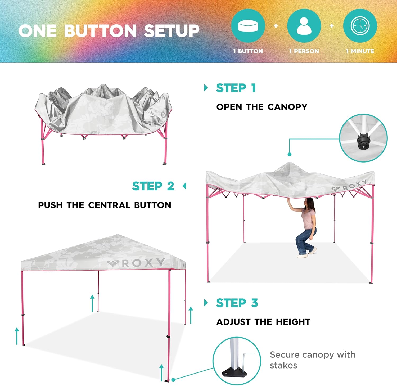 Introducing the ROXY 10×10 Pop Up Canopy, the ultimate solution for all your outdoor shade needs! Whether you’re headed to the beach, tailgating at a game, enjoying a festival, or camping in the great outdoors, this portable shade shelter has got you covered.